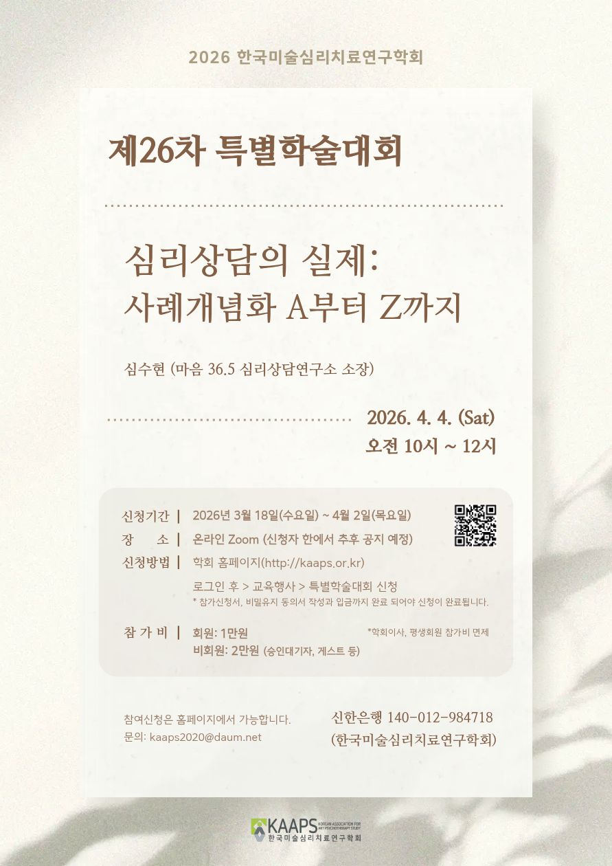 - 「미술심리치료연구」 제5권 2호 논문모집 연장 안내(마감 26.2.14/ 발행 26.3.31) 2026.02.04